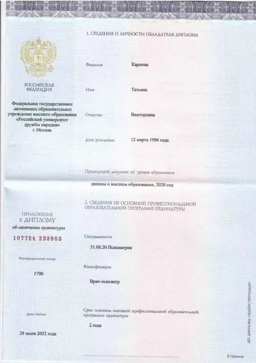 Чуткий и внимательный психиатр-нарколог, это залог успешного выздоровления. Главным преимуществом Татьяны Викторовны как специалиста, является желание помогать людям в любой ситуации. Карпова Татьяна Викторовна окночила Кубанский государственный медицинский университет и Российский университет дружбы народов по специальности - Психиатрия